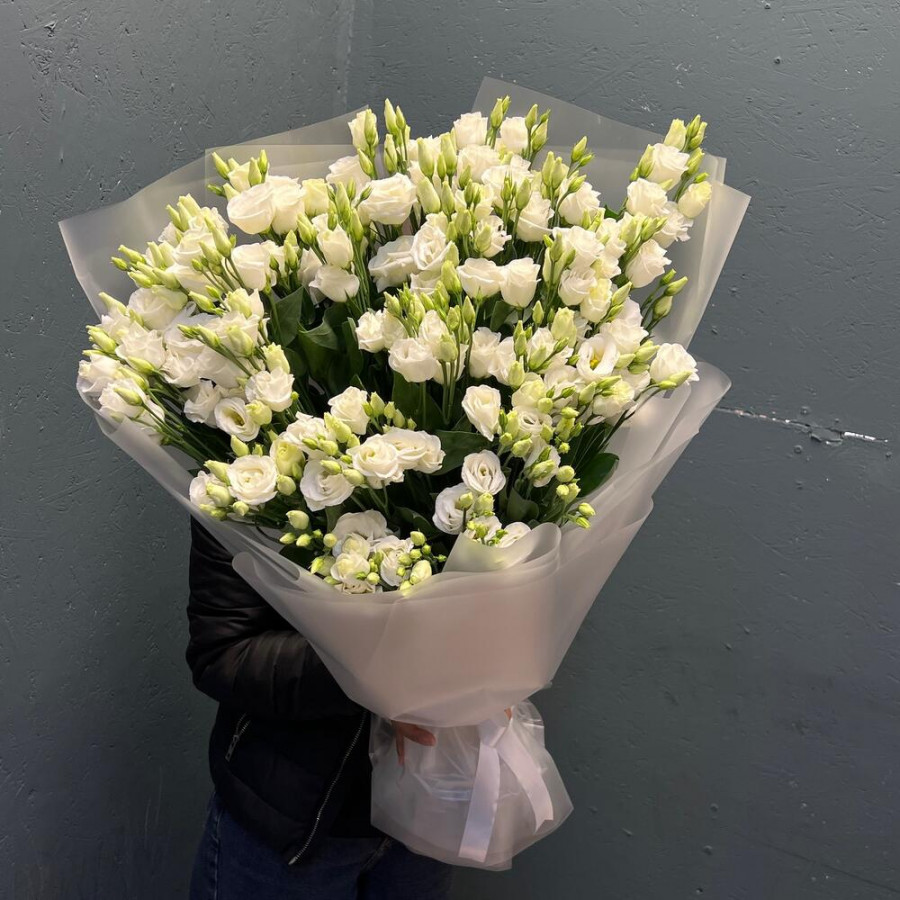 На фото монобукет из 21 белой эустомы. В составе: эустома (лизиантус) 21 шт, дизайнерская упаковка 2 шт, атласная лента 1 шт, . Все цветы свежие и ароматные, букет красиво оформлен и отлично подходит для подарка. Доступна доставка цветов или самовывоз.