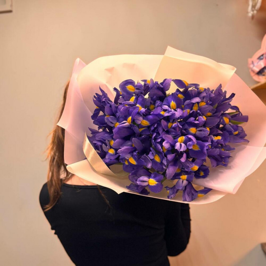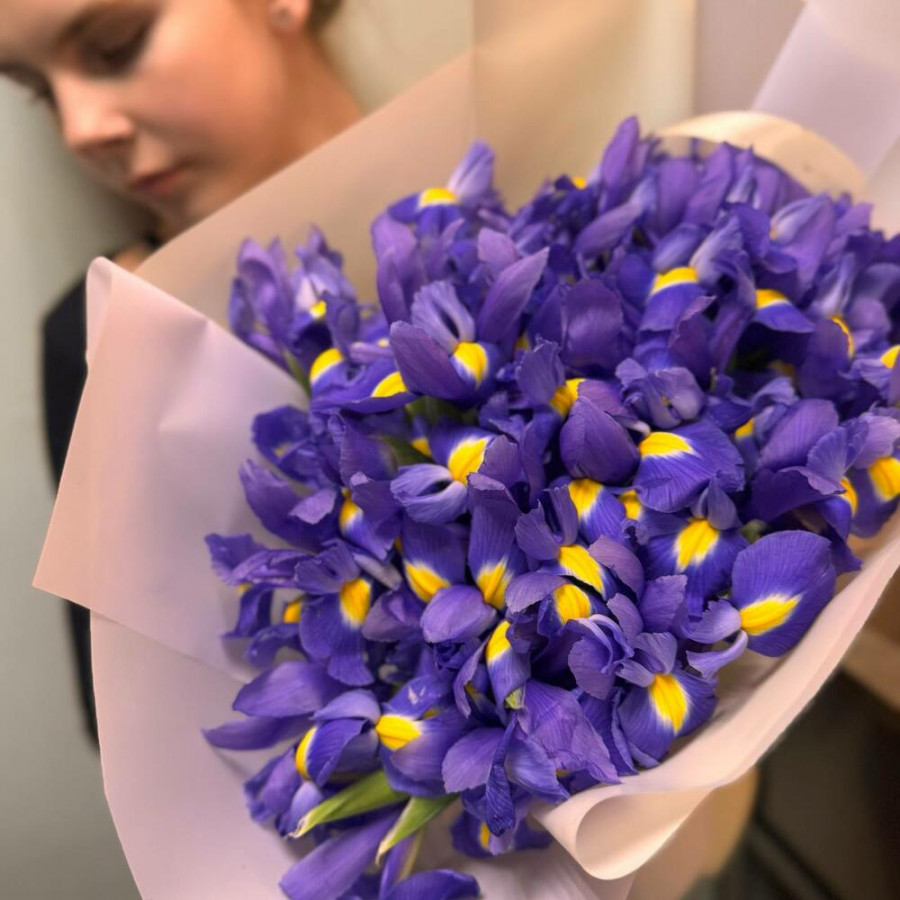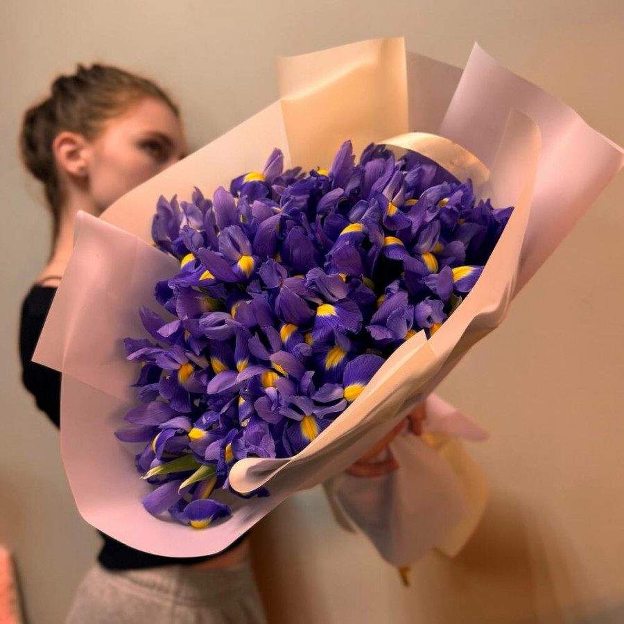 На фото букет из 35 фиолетовых ирисов. В составе: ирис 35 шт, дизайнерская упаковка 2 шт, атласная лента 2 шт, . Все цветы свежие и ароматные, букет красиво оформлен и отлично подходит для подарка. Доступна доставка цветов или самовывоз.