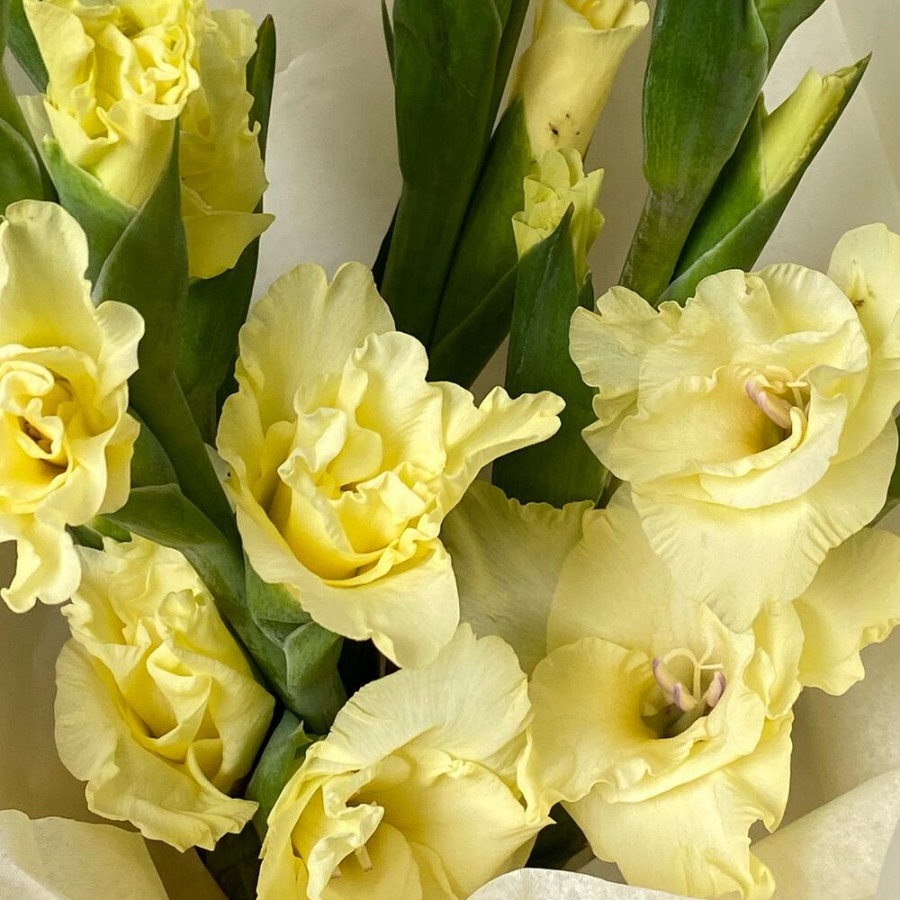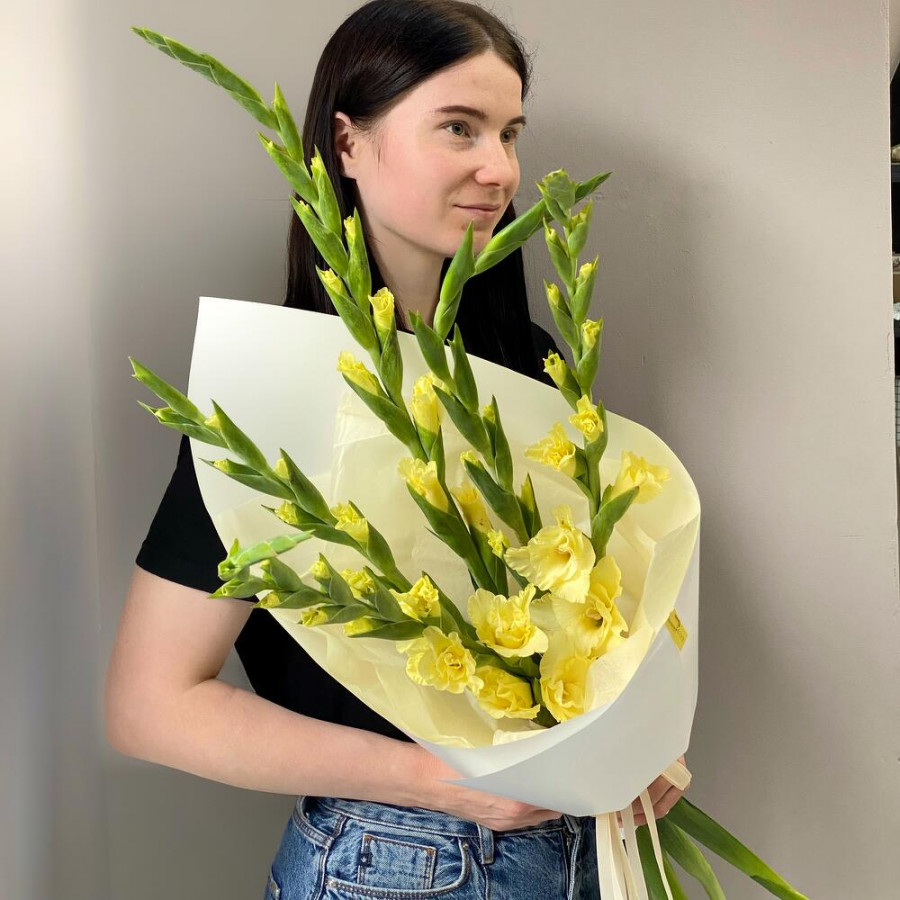 Лента - 3 шт. Тишью - 1 шт. Упаковка дизайнерская - 1 шт. Гладиолус желтый - 5 шт.