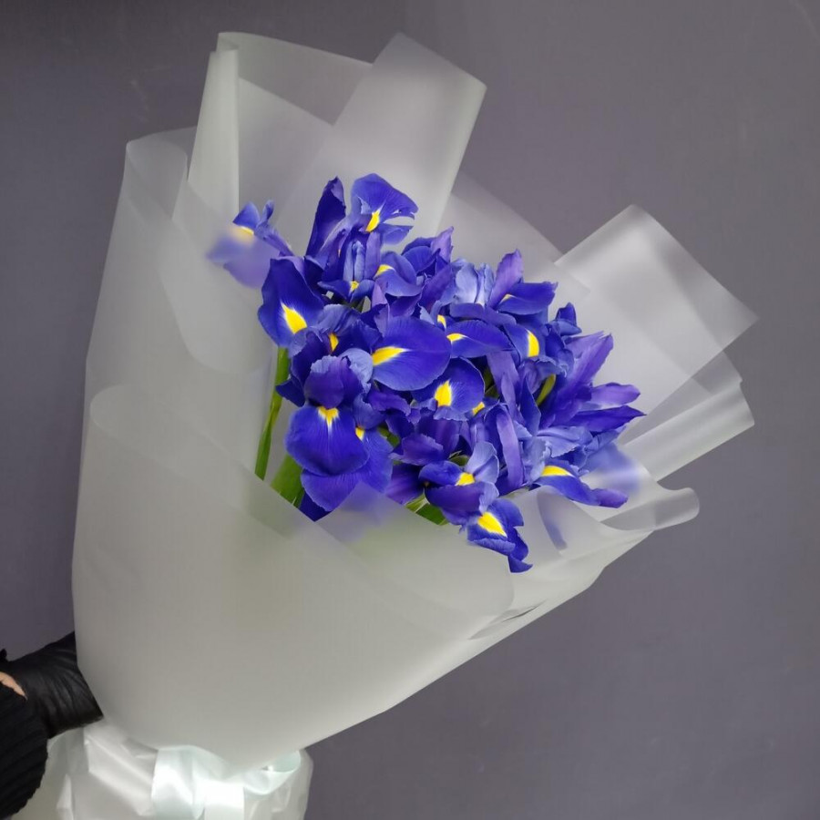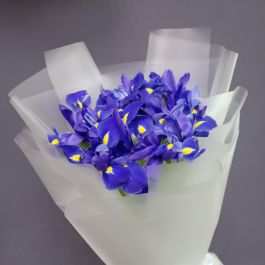 На фото букет из 9 синих ирисов. В составе: ирис 9 шт, дизайнерская упаковка 1 шт, атласная лента 1 шт, . Все цветы свежие и ароматные, букет красиво оформлен и отлично подходит для подарка. Доступна доставка цветов или самовывоз.