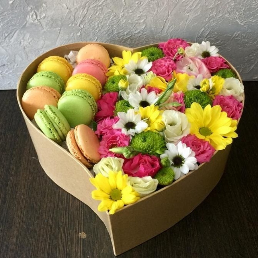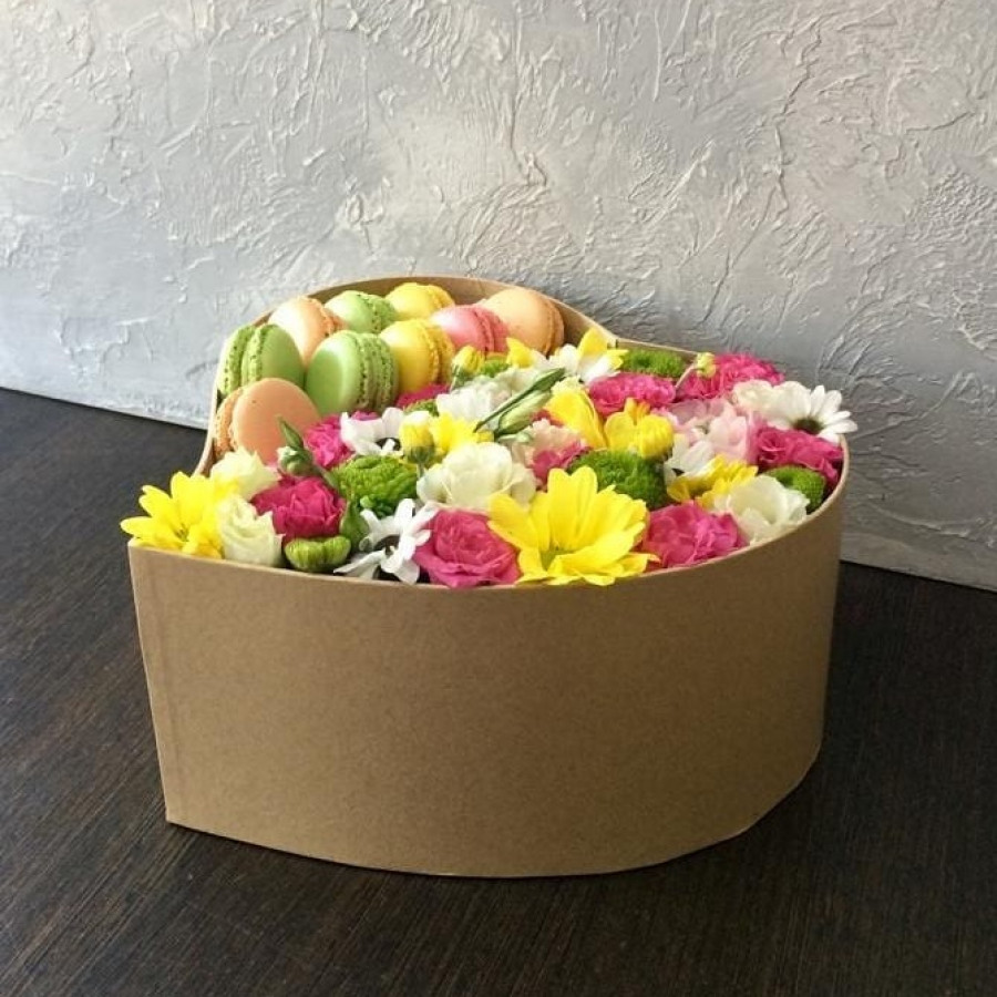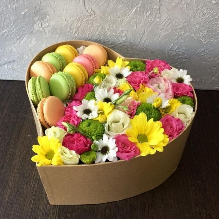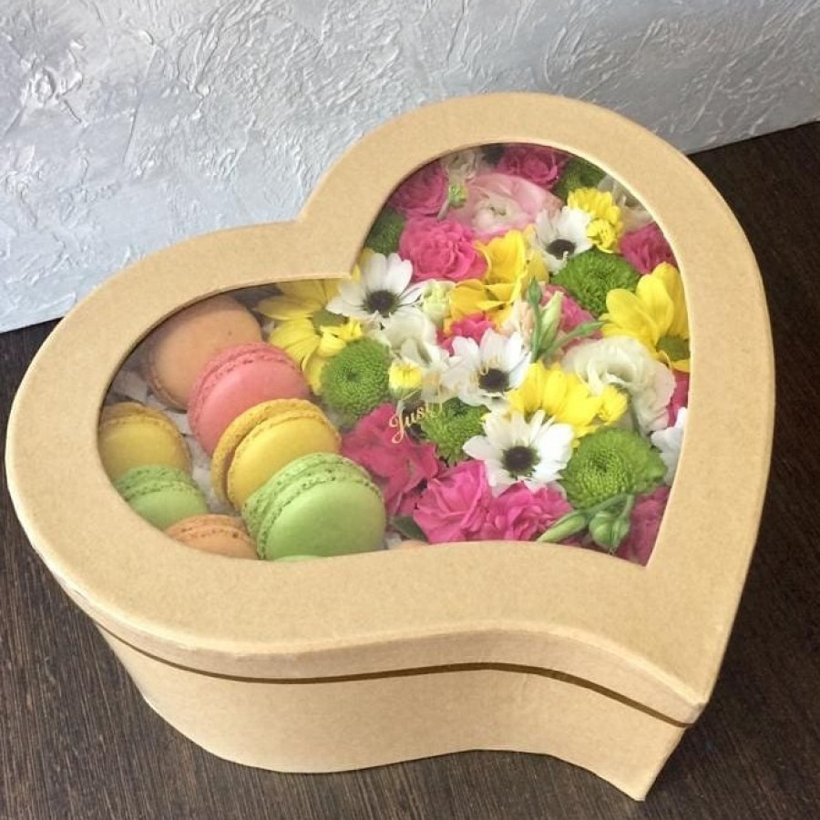 9 макарун с цветами в коробке сердцем в Гусь-Хрустальном