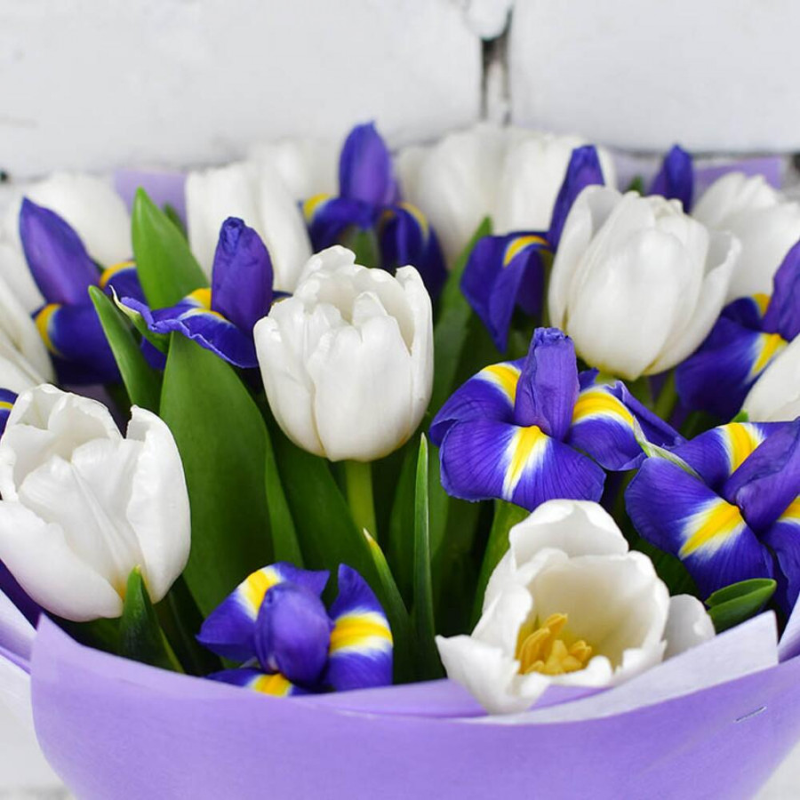На фото букет из синих ирисов и белых тюльпанов. В составе: ирис 10 шт, тюльпан 13 шт, крафт-бумага 1 шт, атласная лента 1 шт, . Все цветы свежие и ароматные, букет красиво оформлен и отлично подходит для подарка. Доступна доставка цветов или самовывоз.
