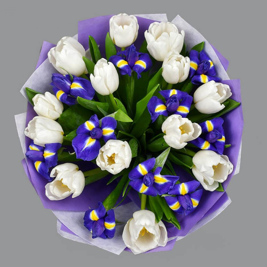 Букет из синих ирисов и белых тюльпанов