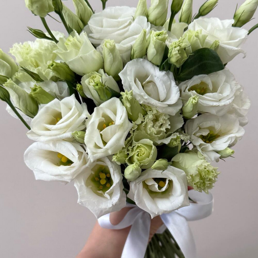На фото букет из белых эустом для невесты. В составе: эустома (лизиантус) 5 шт, атласная лента 2 шт, . Все цветы свежие и ароматные, букет красиво оформлен и отлично подходит для подарка. Доступна доставка цветов или самовывоз.