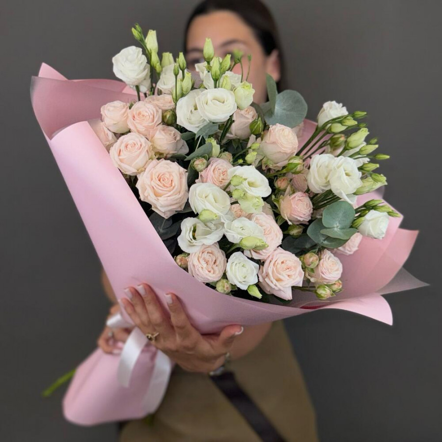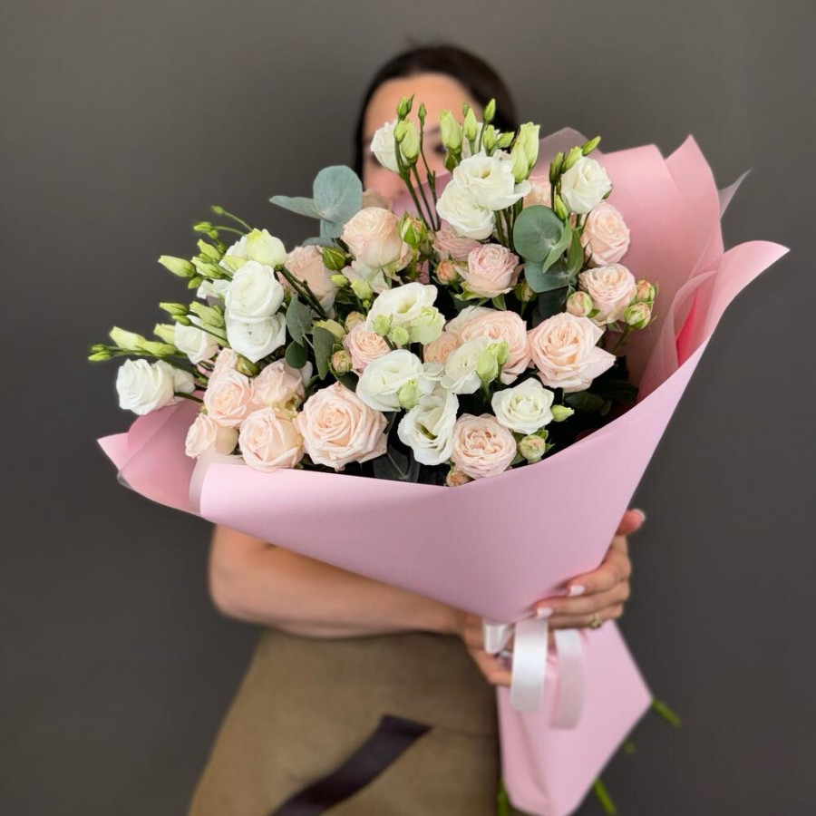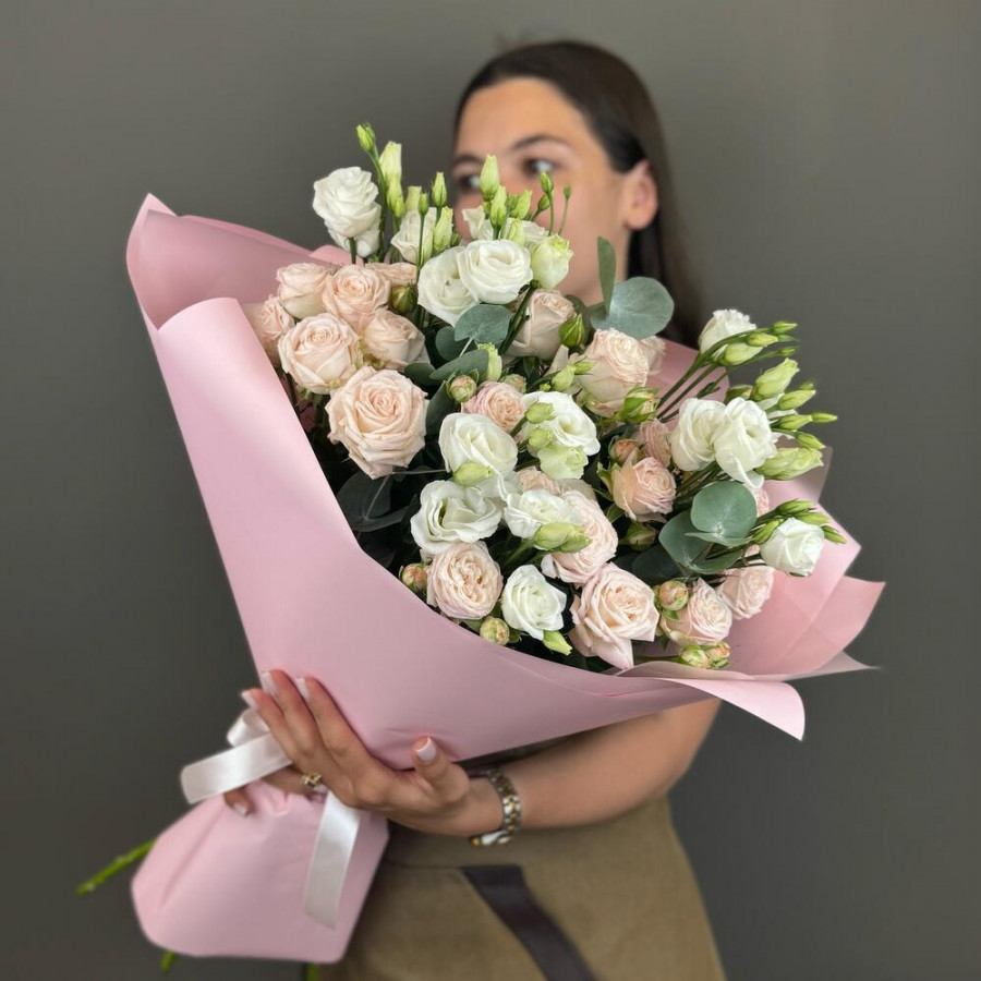 На фото букет из розовых кустовых роз и белых эустом. В составе: кустовая роза 5 шт, эустома (лизиантус) 3 шт, эвкалипт 1 шт, дизайнерская упаковка 1 шт, атласная лента 1 шт, . Все цветы свежие и ароматные, букет красиво оформлен и отлично подходит для подарка. Доступна доставка цветов или самовывоз.