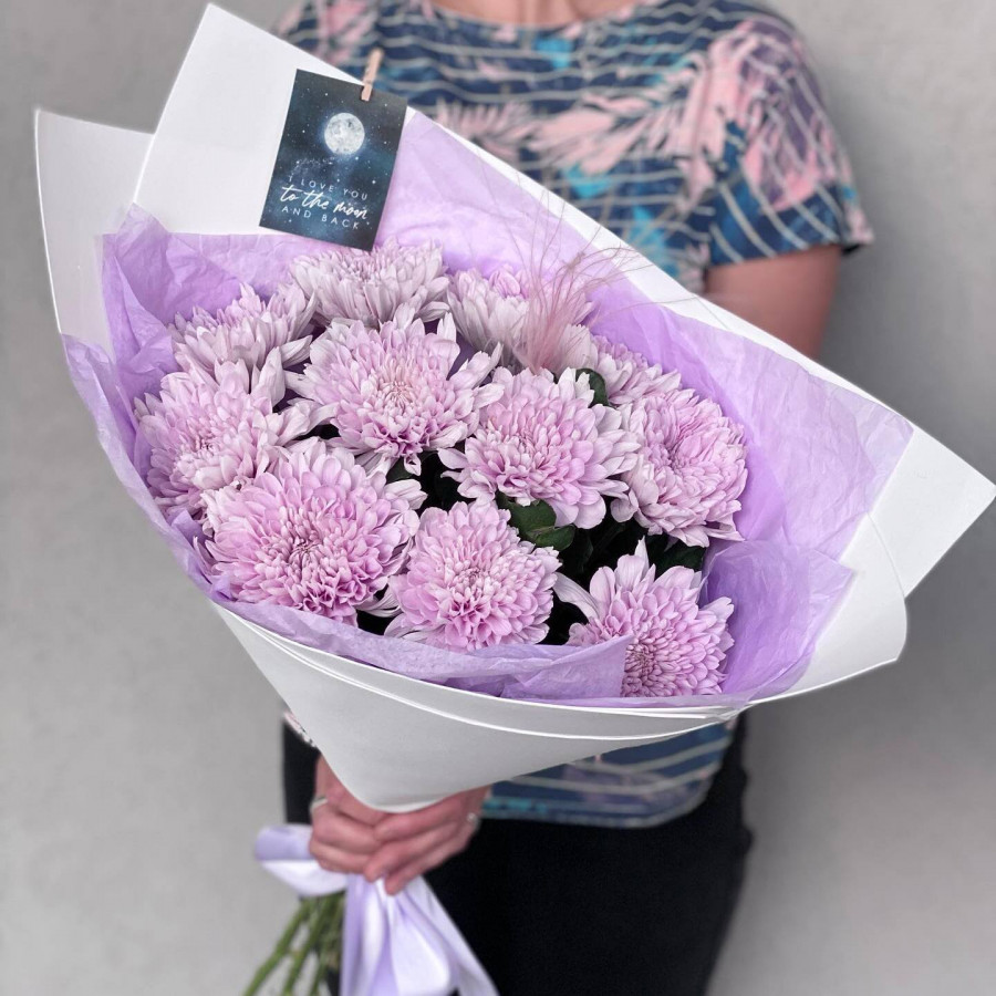 На фото букет из розовых одноголовых хризантем. В составе: хризантема одноголовая 11 шт, крафт-бумага 1 шт, . Все цветы свежие и ароматные, букет красиво оформлен и отлично подходит для подарка. Доступна доставка цветов или самовывоз.