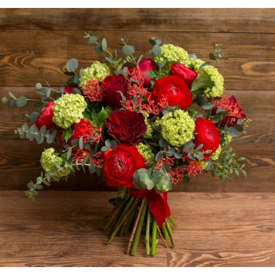 Хотите сделать сюрприз дорогому человеку, закажите именно этот букет. Веточки кудрявого вибурнума в сочетаниями с яркими и необычными соцветиями ранункулюса между семью пионовидными розами зададут превосходное, по-настоящему волшебное настроение на весь день. Свежайшие цветы с непревзойденным тонким ароматом, декорированные листочками эвкалипта и писташа приведут в восторг самых утонченных натур.