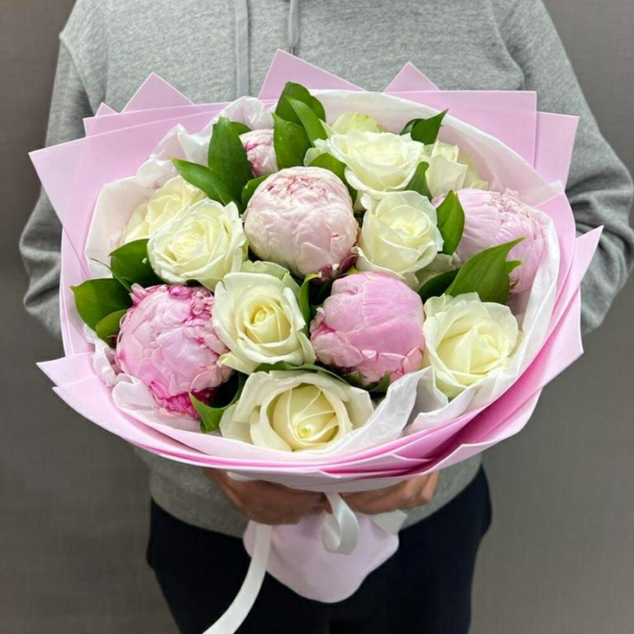 На фото букет «трепетное чувство». В составе: пион 5 шт, роза 9 шт, фоамиран 1 шт, атласная лента 1 шт, . Все цветы свежие и ароматные, букет красиво оформлен и отлично подходит для подарка. Доступна доставка цветов или самовывоз.