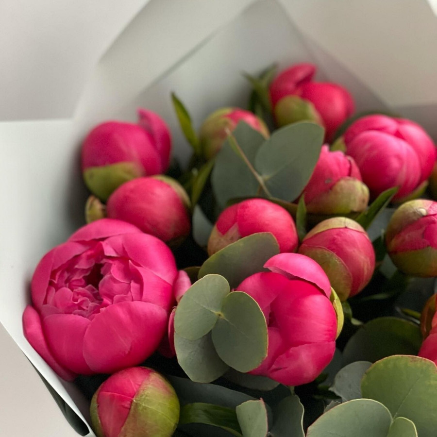 На фото коралловые пионы с эвкалиптом. В составе: пион 17 шт, эвкалипт 5 шт, крафт-бумага 1 шт, атласная лента 1 шт, . Все цветы свежие и ароматные, букет красиво оформлен и отлично подходит для подарка. Доступна доставка цветов или самовывоз.