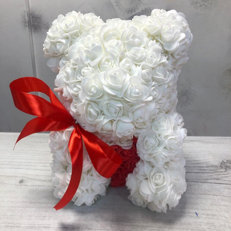 На фото мишка из роз белый. В составе: . Все цветы свежие и ароматные, букет красиво оформлен и отлично подходит для подарка. Доступна доставка цветов или самовывоз.