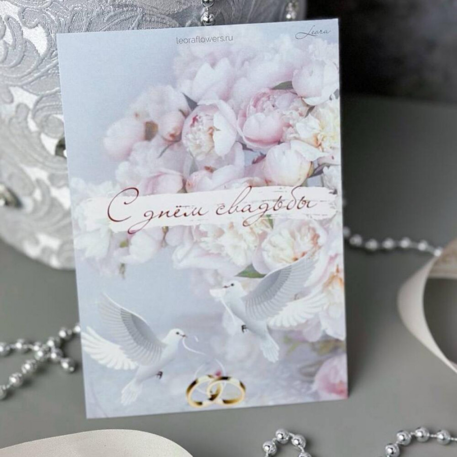 На фото открытка «с днем свадьбы». В составе: . Все цветы свежие и ароматные, букет красиво оформлен и отлично подходит для подарка. Доступна доставка цветов или самовывоз.