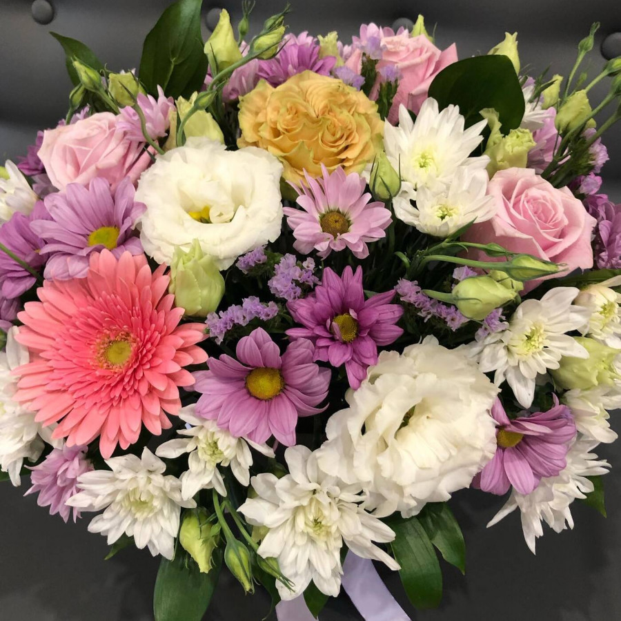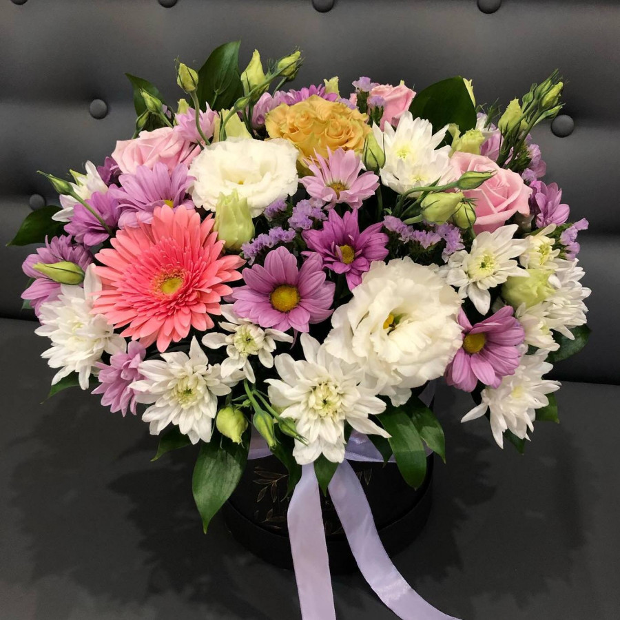 На фото шляпная коробка из сборных цветов. В составе: эустома (лизиантус) 2 шт, гербера 1 шт, статица 4 шт, хризантема кустовая 6 шт, роза 3 шт, коробка (m) 1 шт, . Все цветы свежие и ароматные, букет красиво оформлен и отлично подходит для подарка. Доступна доставка цветов или самовывоз.