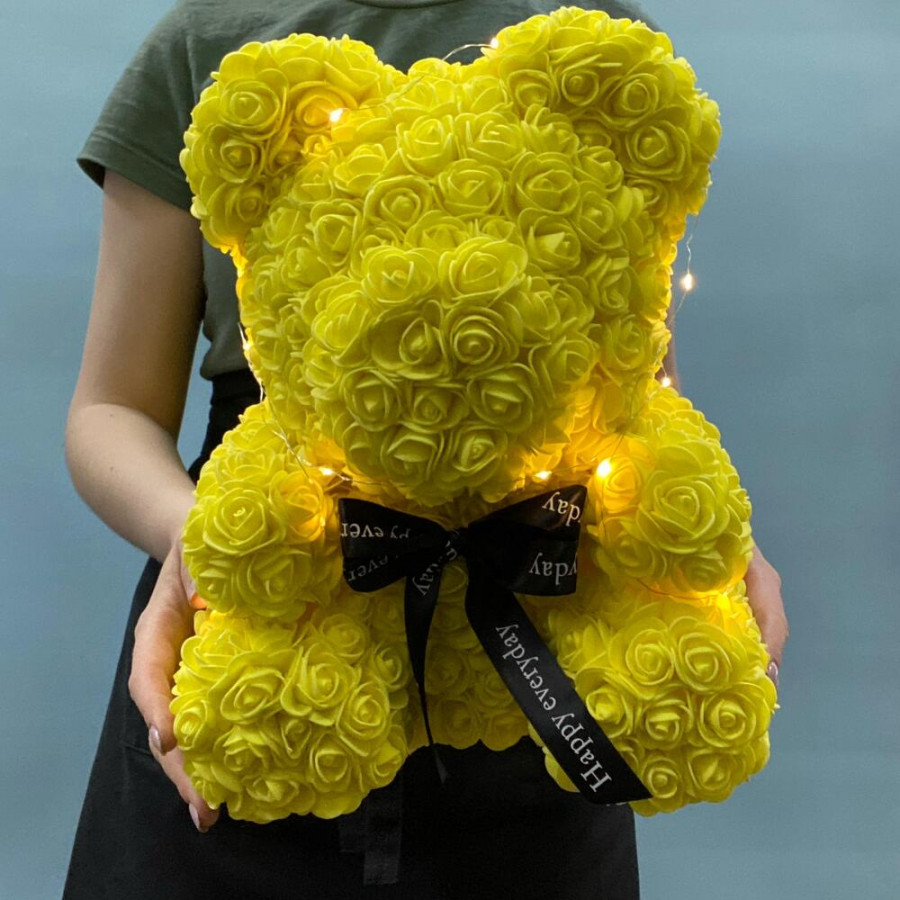 На фото желтый мишка из роз с огоньками. В составе: . Все цветы свежие и ароматные, букет красиво оформлен и отлично подходит для подарка. Доступна доставка цветов или самовывоз.